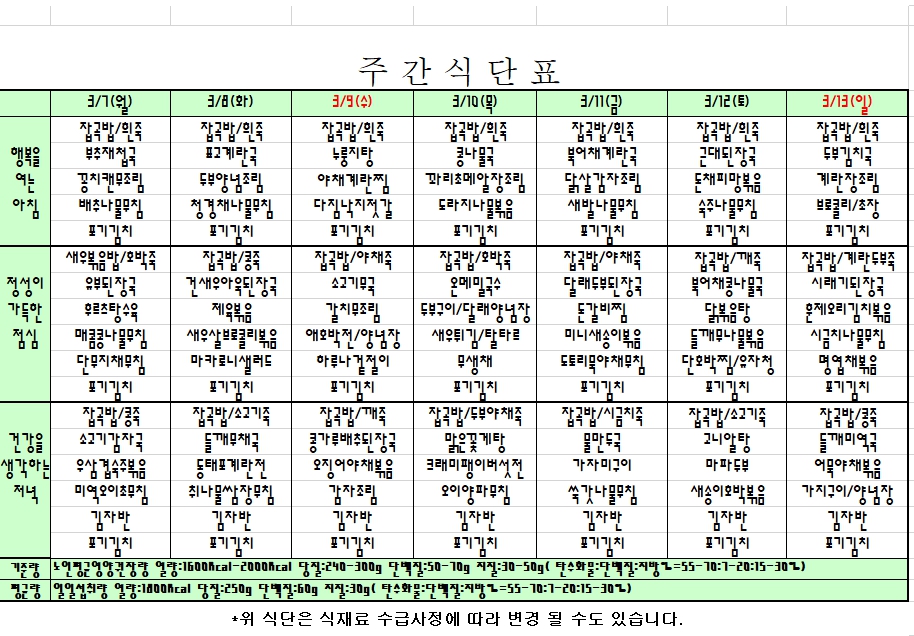 2022. 03. 07 ~ 03. 13  주간식단표 입니다.