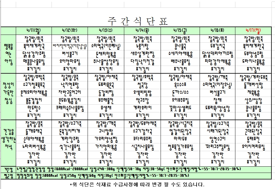 2022. 04. 11 ~ 04. 17  주간식단표 입니다.