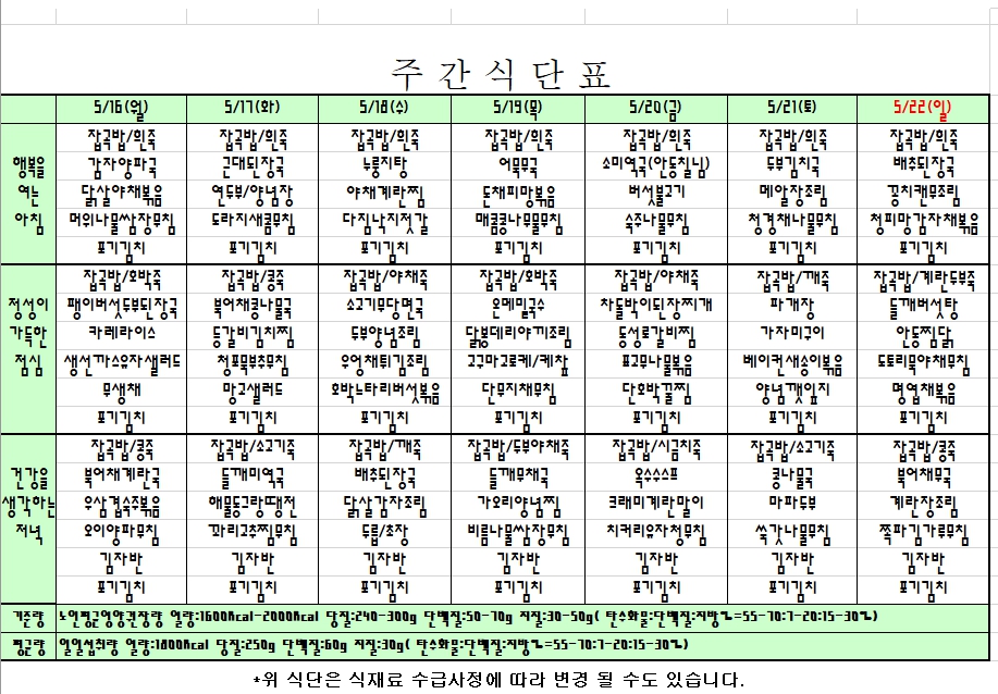 2022. 05. 16 ~ 05. 22  주간식단표 입니다.