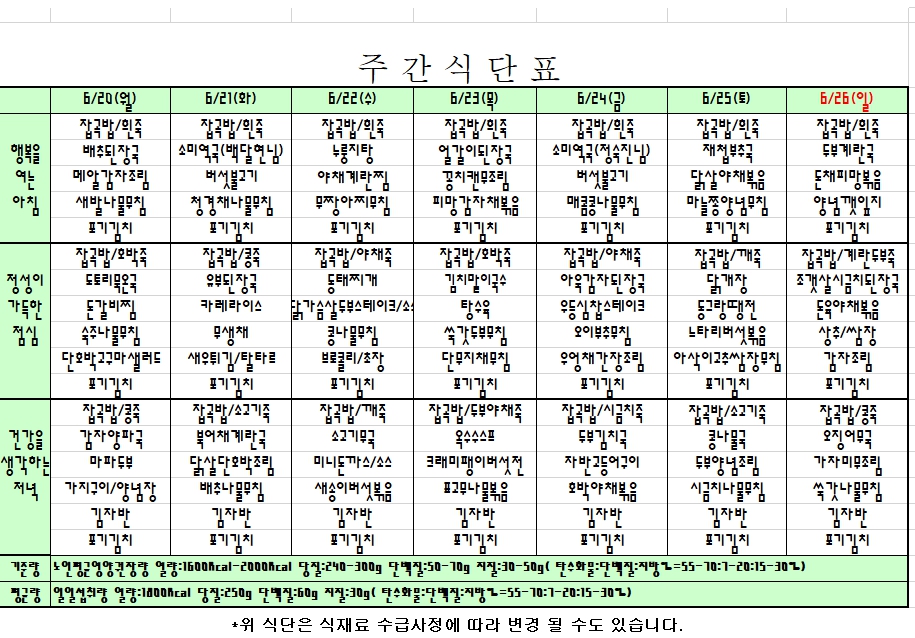 2022. 06. 20 ~ 06. 26 주간식단표