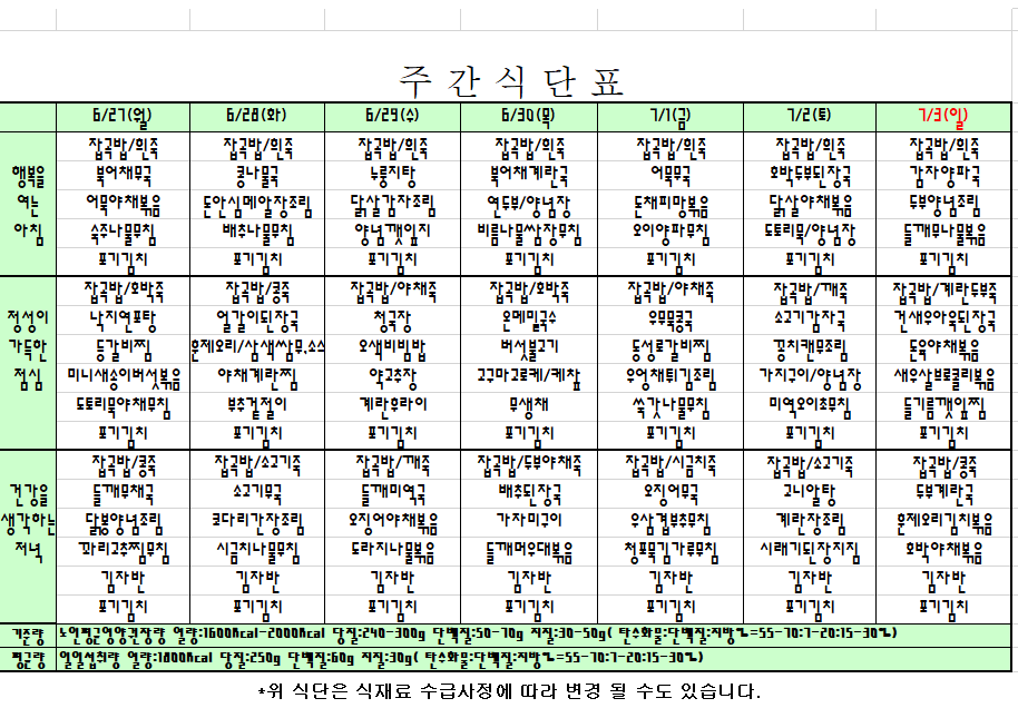 2022. 06. 27 ~ 07. 03  주간식단표 입니다.