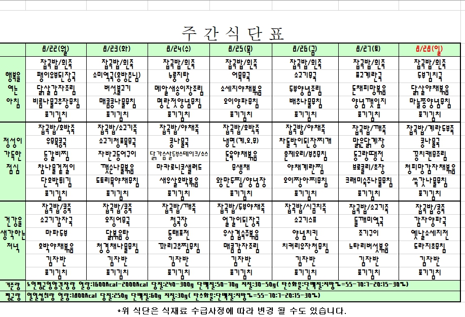 2022. 08. 22 ~ 08. 28 주간식단표
