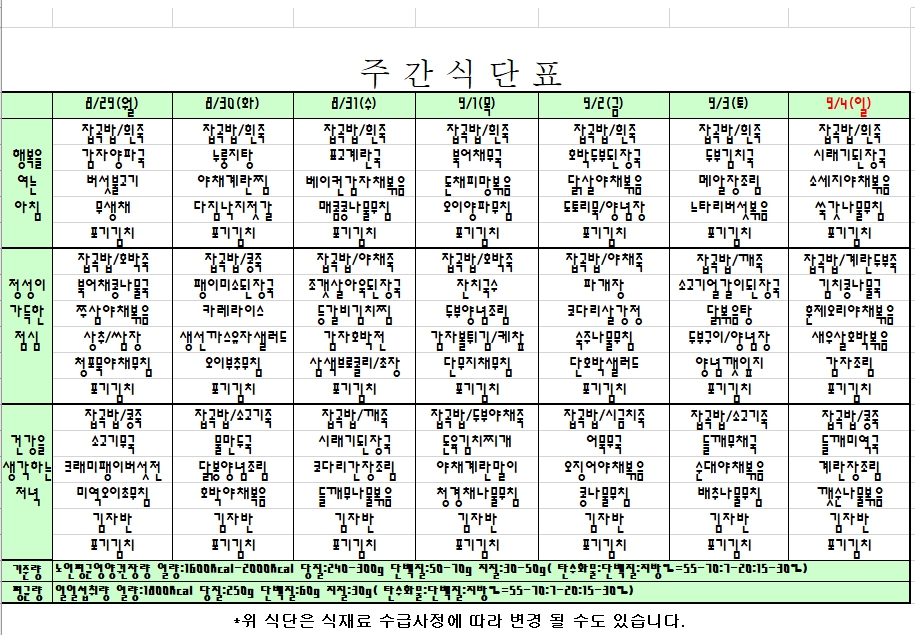 2022. 08. 29 ~ 09. 04 주간식단표