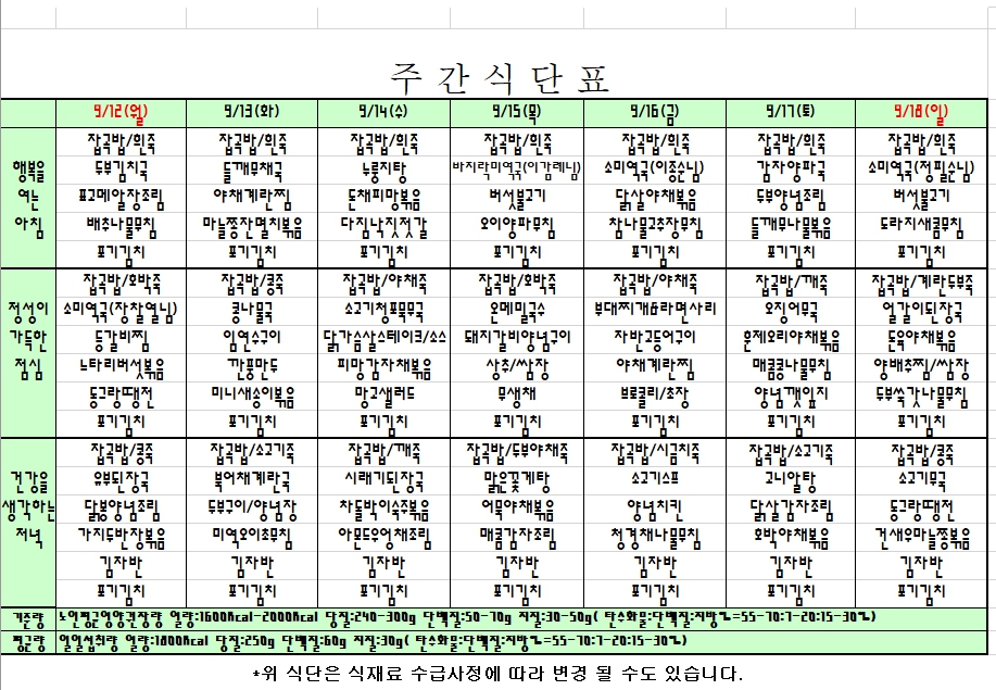 2022. 09. 12 ~ 09. 18 주간식단표