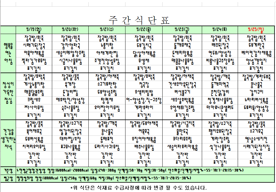 2022. 09. 19 ~ 09. 25  주간식단표 입니다.
