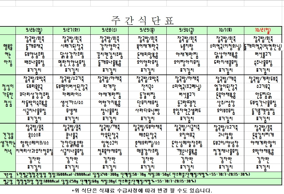 2022. 09. 26 ~ 10. 02  주간식단표 입니다.