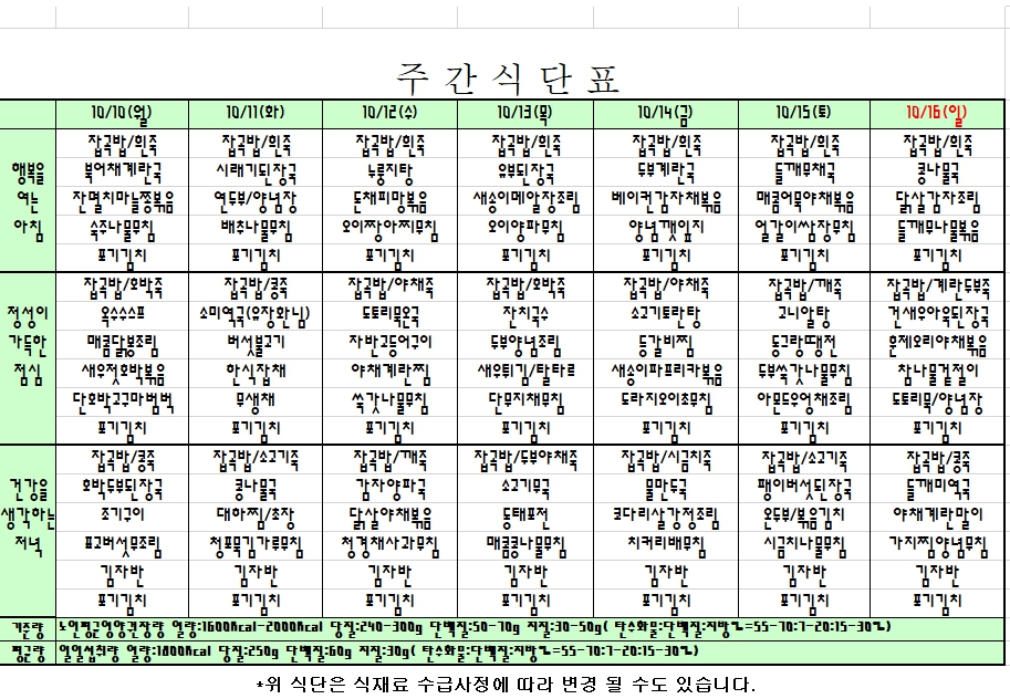 2022. 10. 10 ~ 10. 16  주간식단표 입니다.