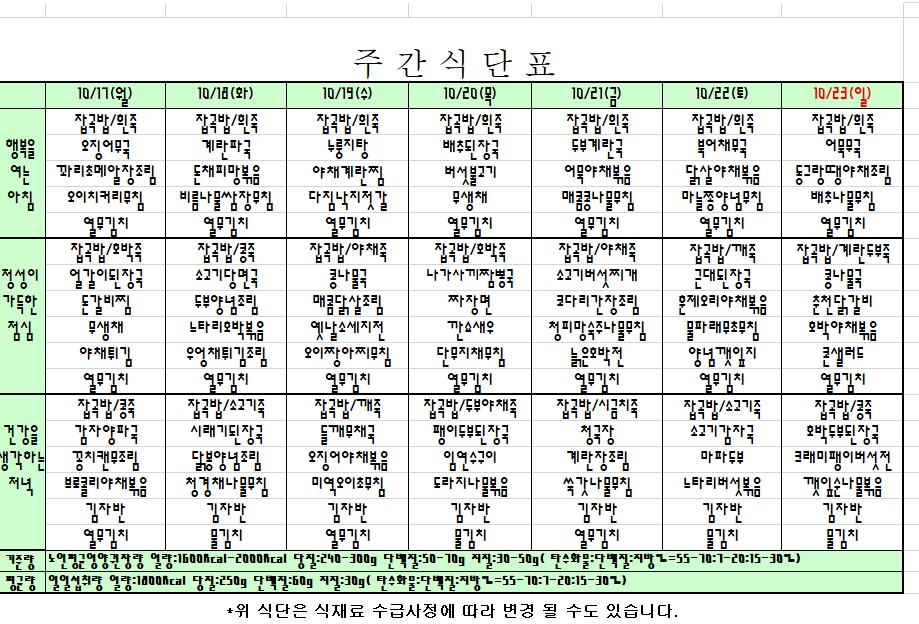 2022. 10. 17 ~ 10. 23 주간식단표