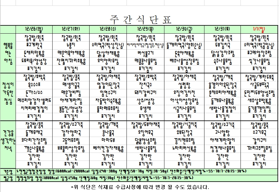 2022. 12. 26 ~ 23. 01. 01 주간식단표