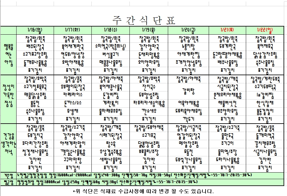 2023. 1. 16 ~ 1. 22 주간식단표 입니다. |