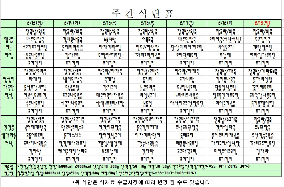 2023. 2. 13 ~ 2. 19 주간식단표 입니다. |