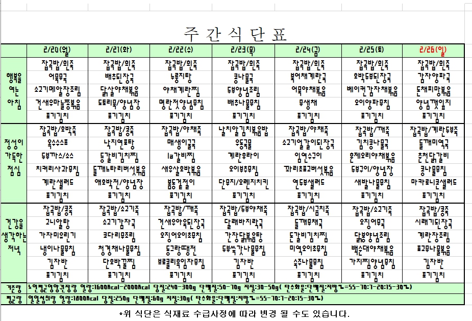 2023. 2. 20 ~ 2. 26 주간식단표 입니다. |