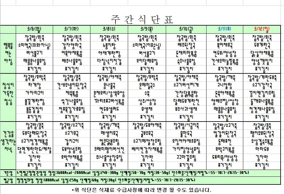 2023. 3. 6 ~ 3. 12 주간식단표 입니다. |
