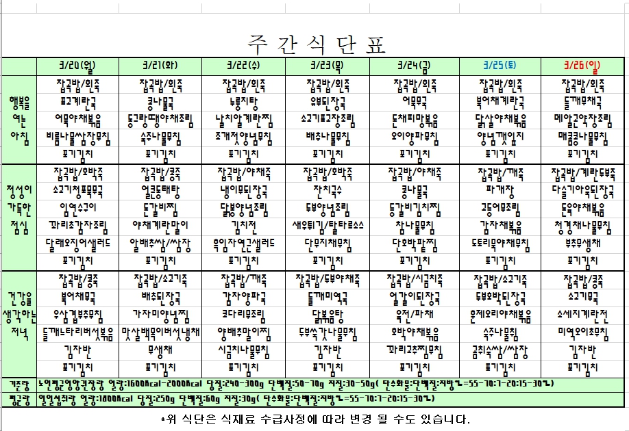 2023. 3. 20 ~ 3. 26 주간식단표 입니다. |