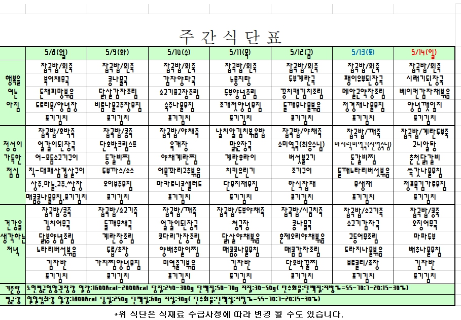 2023. 5. 8 ~ 5. 14 주간식단표 입니다. |
