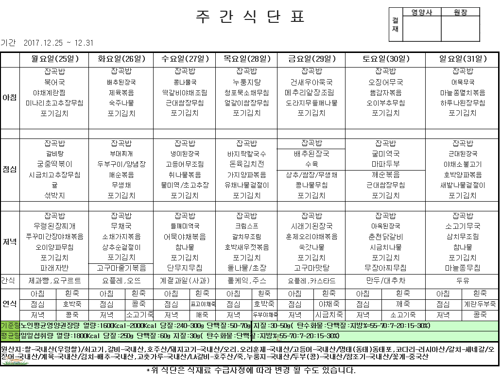 | 2017년 12월 25일 ~ 31일 식단표 관리자2017-12-26조회수 3584 |