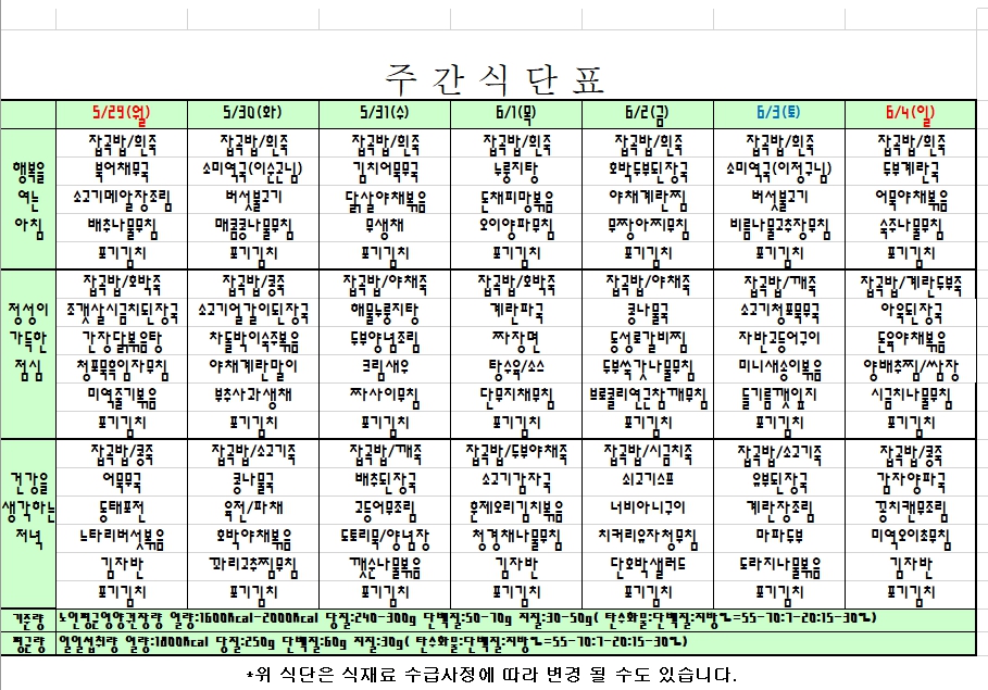 2023. 5. 29 ~ 6. 4 주간식단표 입니다. |