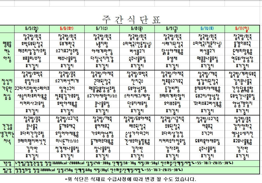 2023. 6. 5 ~ 2023. 6. 11 주간식단표 입니다. |