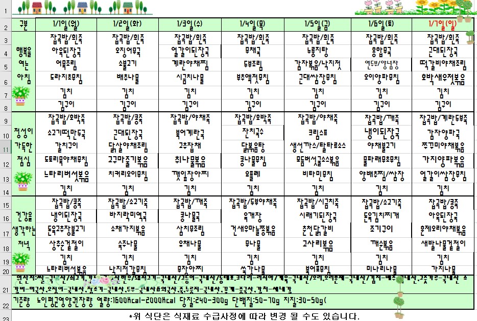 | 2018 년 1월 1일 ~ 7일 식단표 관리자2018-01-02조회수 3616 |