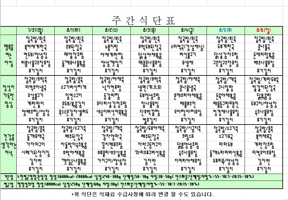 2023. 7. 31 ~ 8. 6 주간식단표 입니다. |