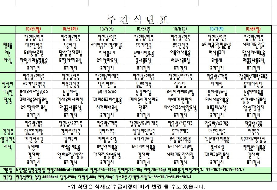 2023. 10. 2 ~ 10. 8 주간식단표 입니다. |