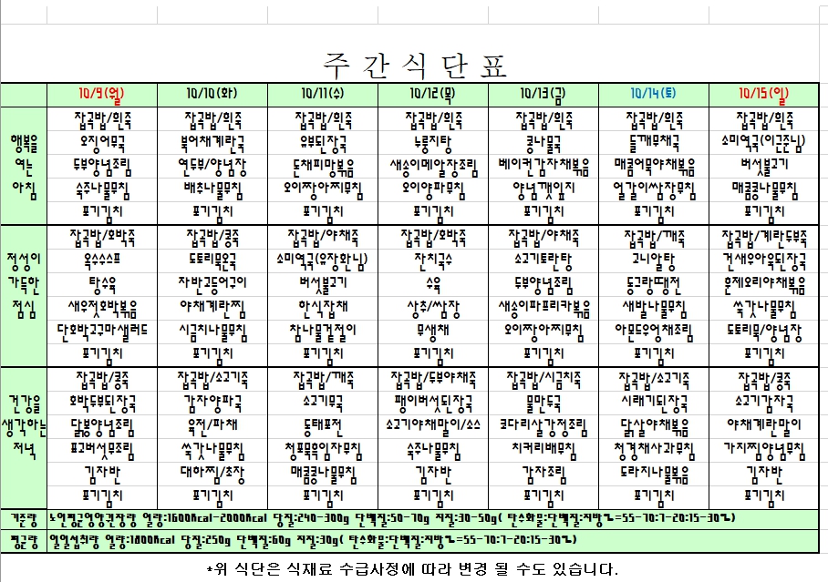 2023. 10. 9 ~ 10. 15 주간식단표 입니다. |