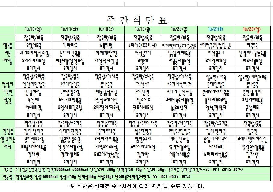 2023. 10. 16 ~ 10. 22 주간식단표 입니다. |