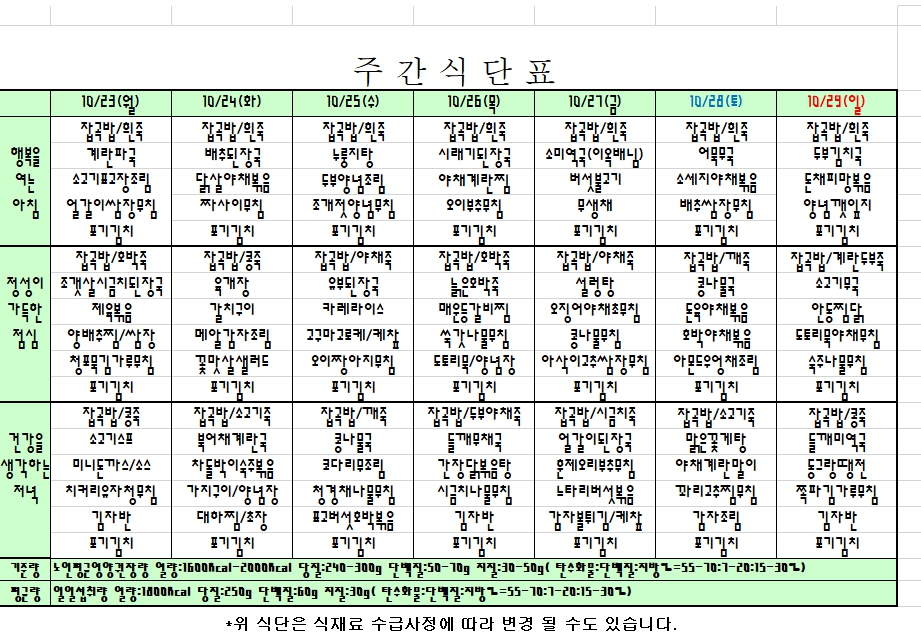 2023. 10. 23 ~ 10. 29 주간식단표 입니다. |