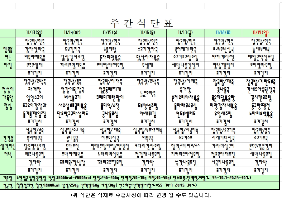 2023. 11. 13 ~ 11. 19 주간식단표 입니다. |