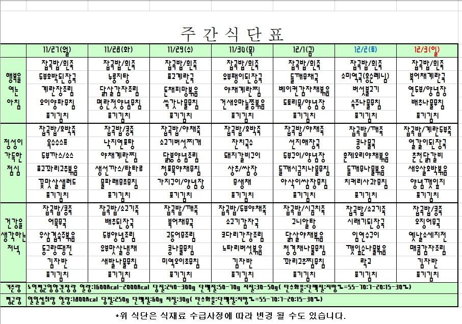 2023. 11. 27 ~ 12. 3 주간식단표 입니다. |