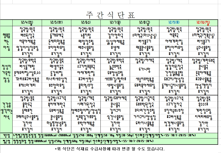 2023. 12. 4 ~ 12. 10 주간식단표 입니다. |