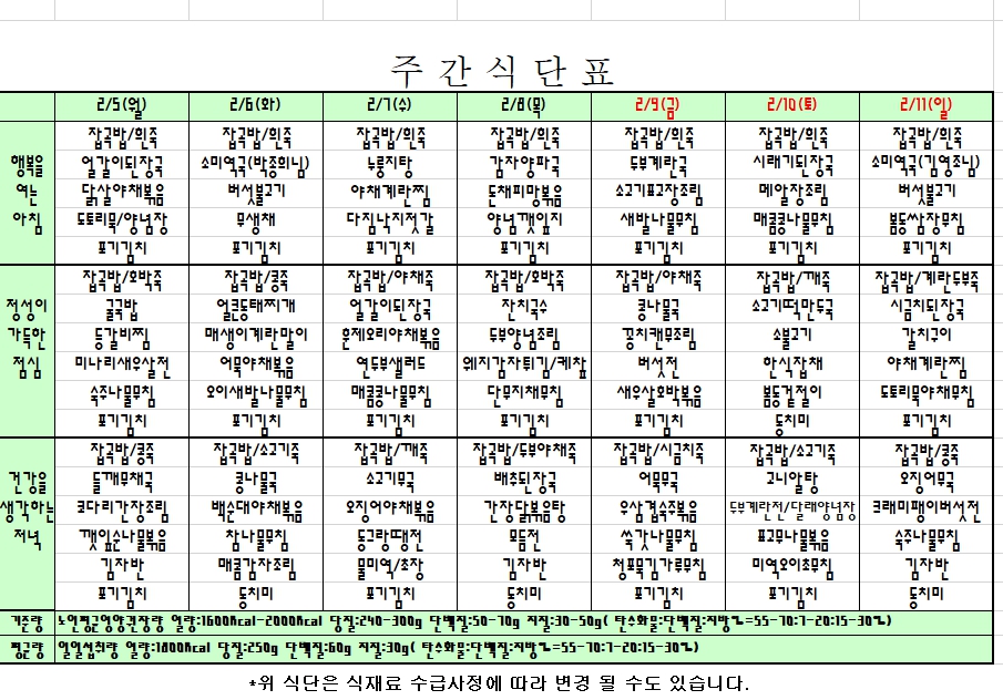 2024. 2. 5 ~ 2. 11 주간식단표 입니다. |
