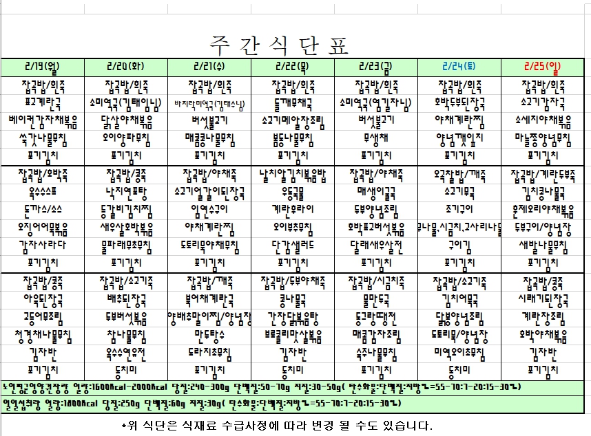 2024. 2. 19 ~ 2. 25 주간식단표 입니다. |