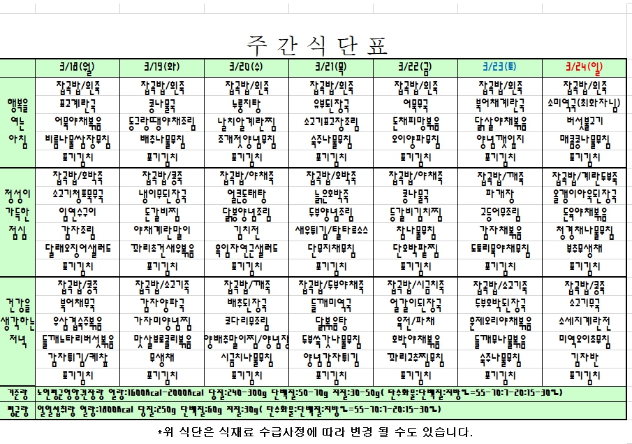 2024. 3. 18 ~ 3. 24 주간식단표 입니다. |