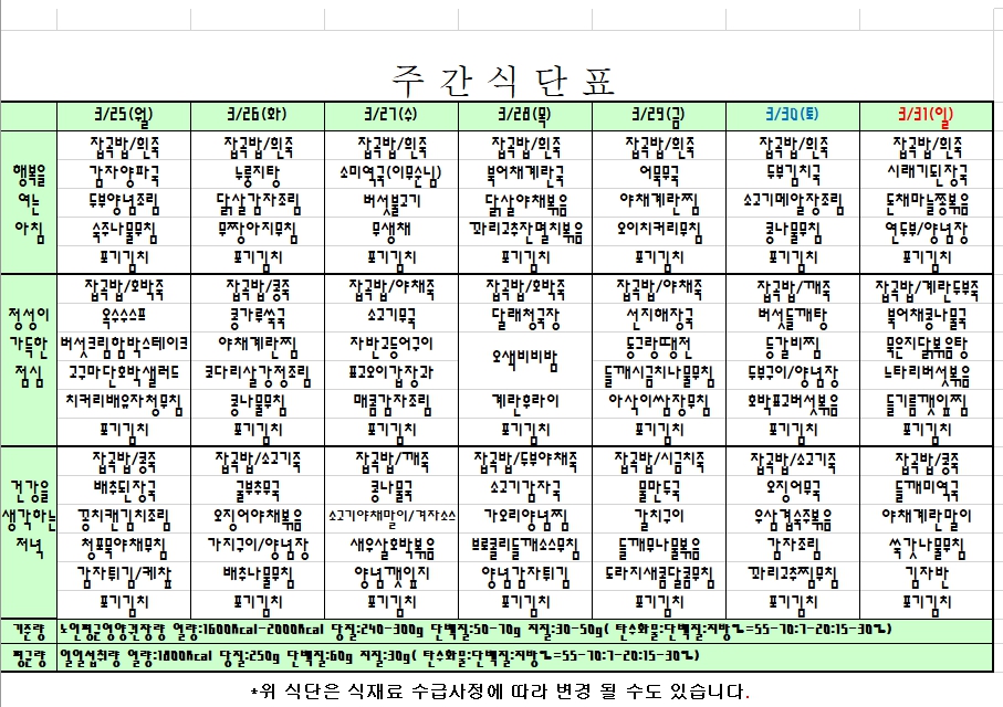2024. 3. 25 ~ 3. 31 주간식단표 입니다. |