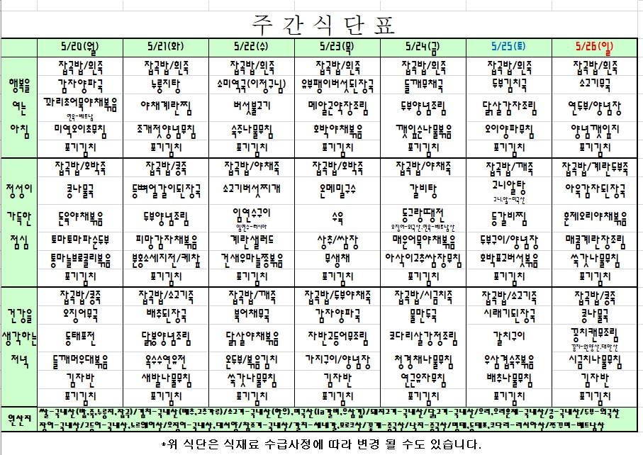 2024. 5. 20 ~ 5. 26 주간식단표 입니다. |