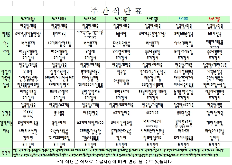 2024. 5. 27 ~ 6. 2 주간식단표 입니다. |