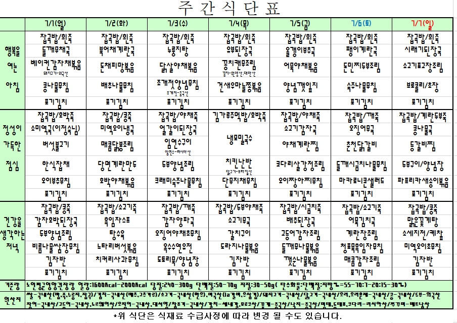 2024. 7. 1 ~ 7. 7 주간식단표 입니다. |