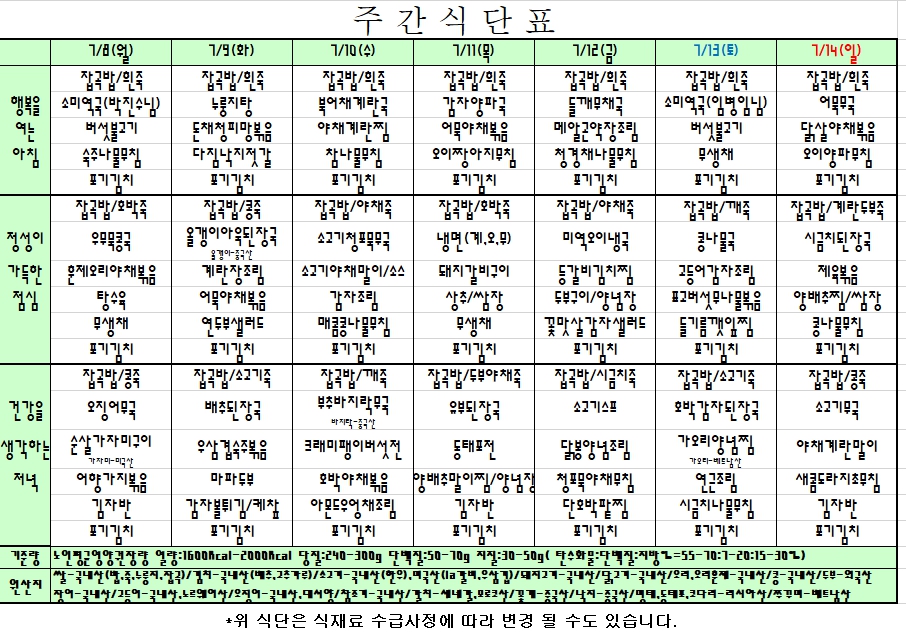 2024. 7. 8 ~ 7. 14 주간식단표 입니다. |