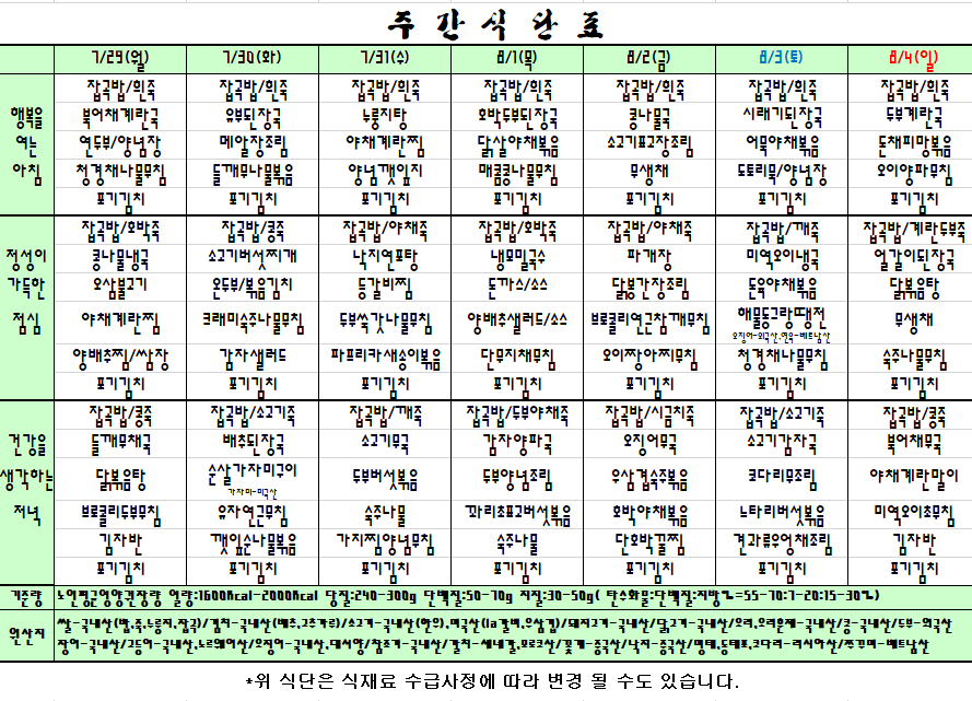 2024. 7. 29 ~ 8. 4 주간식단표 입니다. |