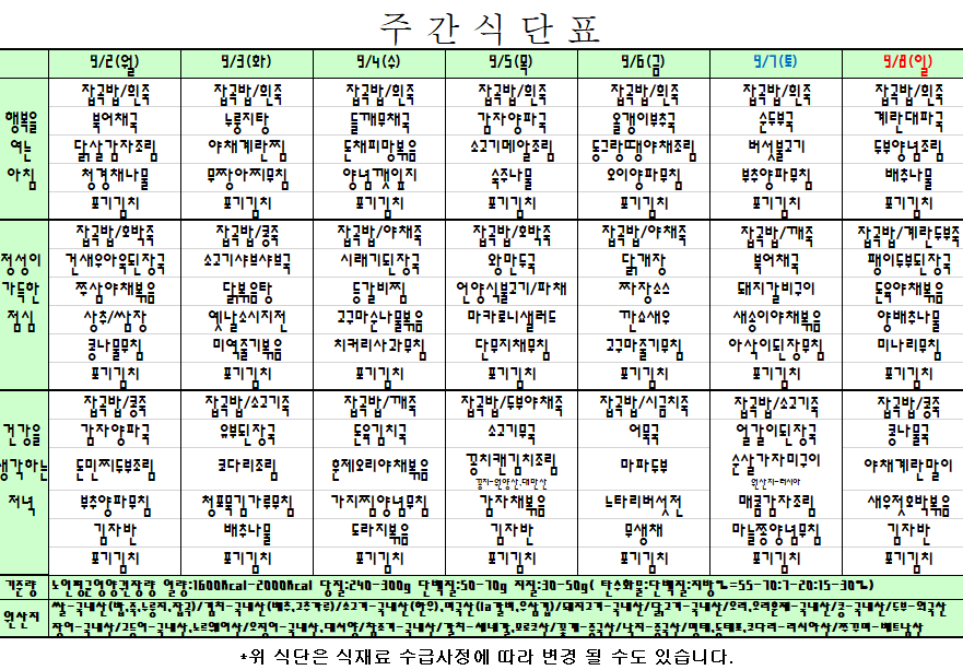 2024. 9. 2 ~ 9. 8 주간식단표입니다. |