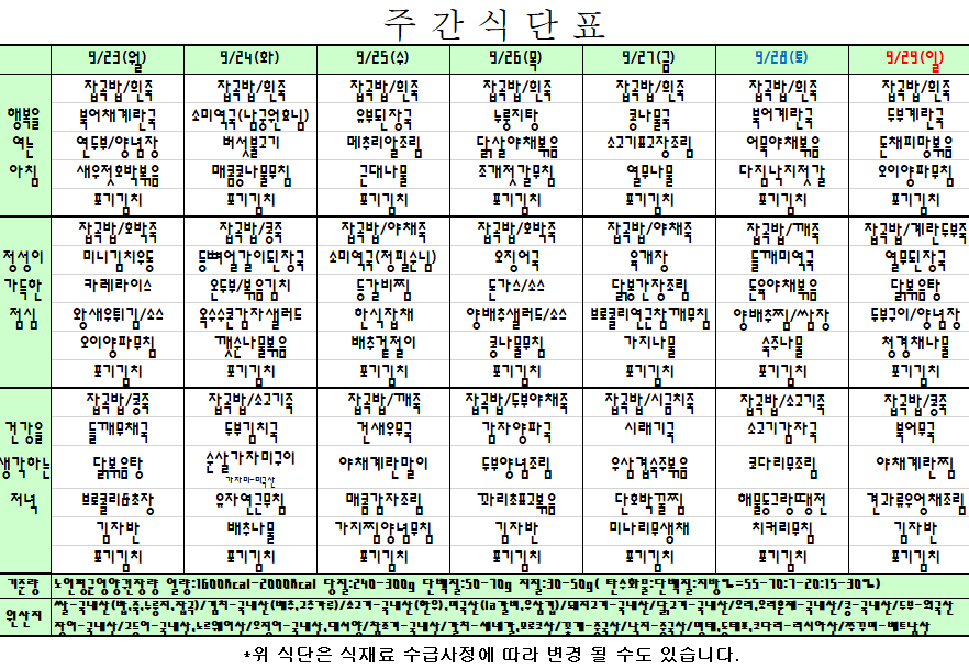 2024. 9. 23 ~ 9. 29 주간식단표입니다. |