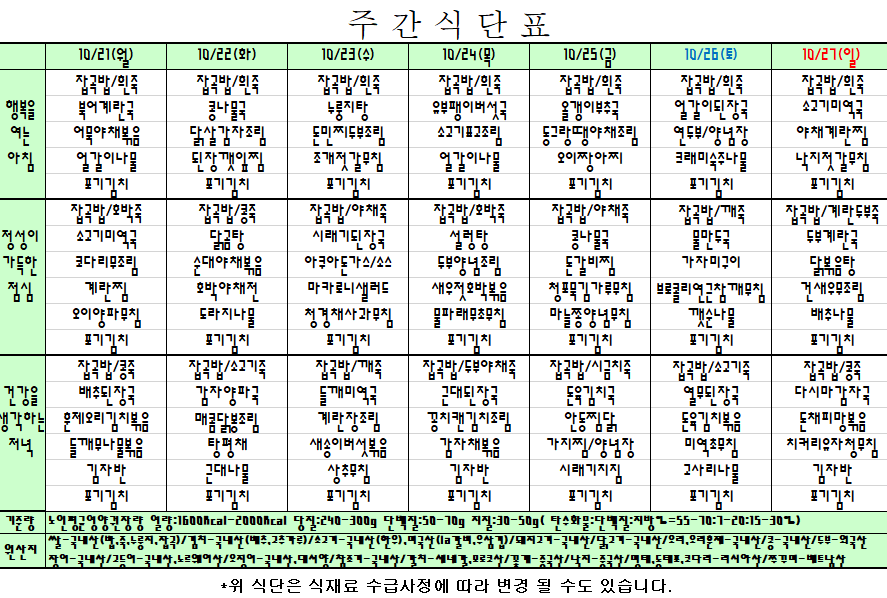 2024. 10. 21 ~ 10. 27 주간식단표입니다. |