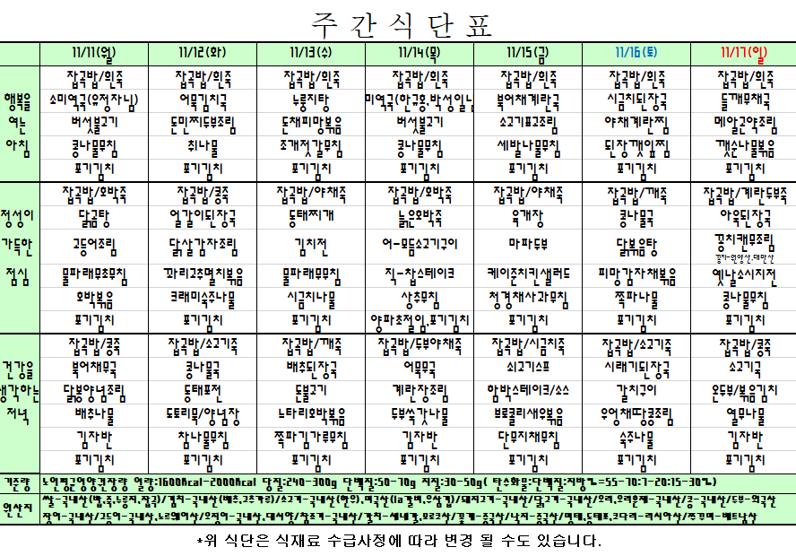 2024. 11. 11 ~ 11. 17 주간식단표입니다. |