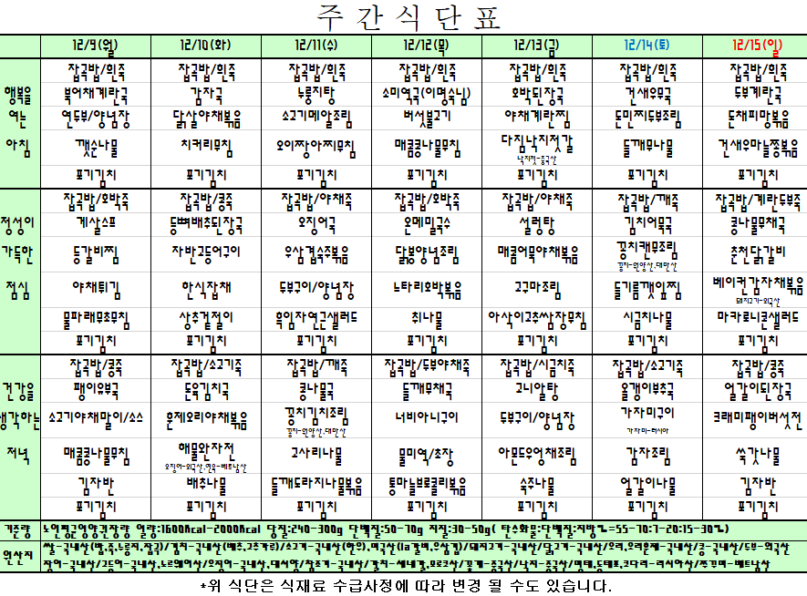 2024. 12. 09~ 12. 15 주간식단표입니다. |