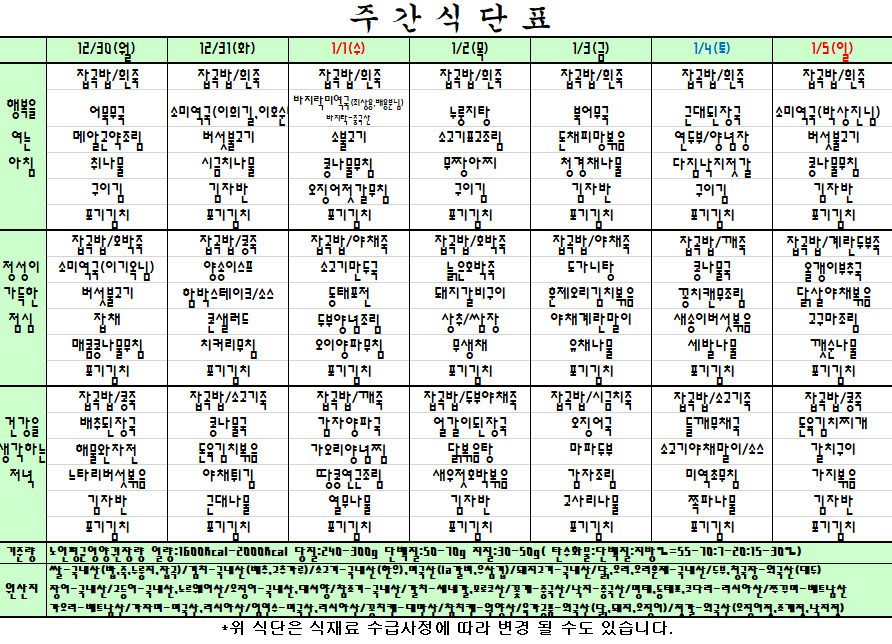 첨부파일 첨부 주간식단표 12.30~1.5.png [File Size:50.3 KB/Download:11]