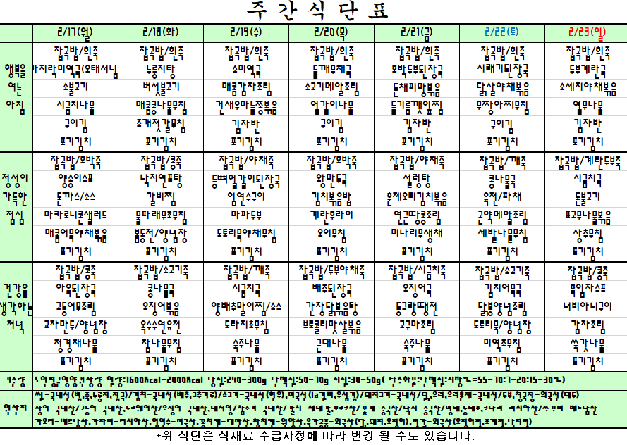 첨부파일 첨부 주간식단표 2.17~2.23.png [File Size:49.1 KB/Download:10]