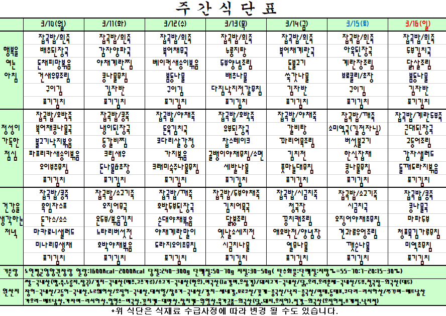 2025. 03. 10~ 2025. 03. 16 주간식단표