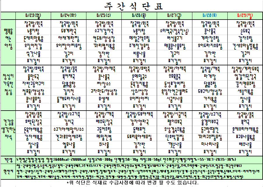 2025. 06. 23~ 2025. 06. 29 주간식단표입니다