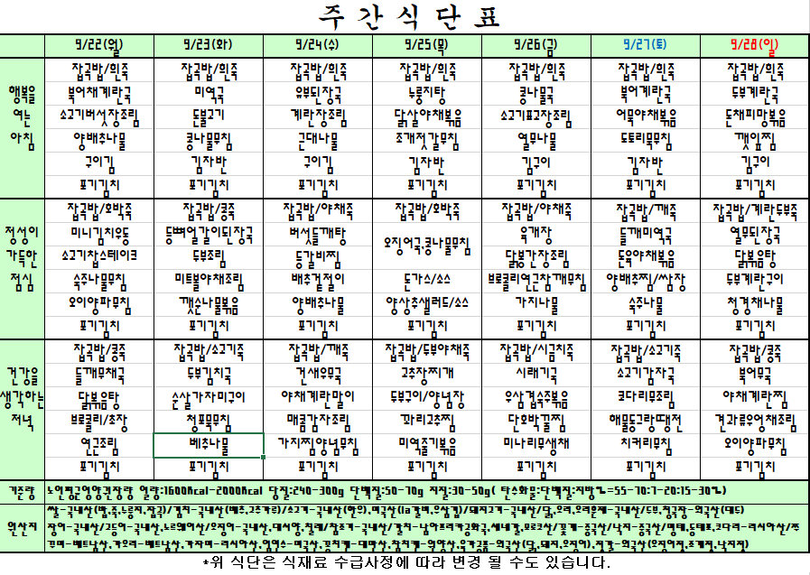 25.9.22~25.9.28 주간식단표